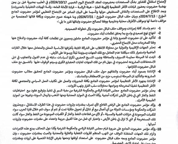 البيان الختامي للاجتماع الاستثنائي لقيادات مؤتمر حضرموت الجامع